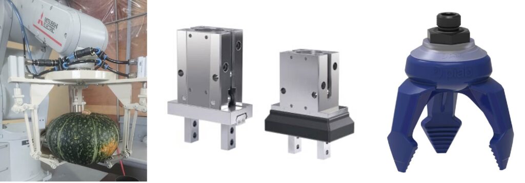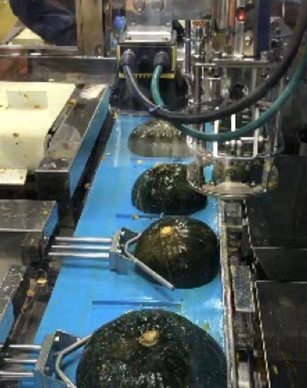 南瓜ヘタ取りは、ロボットアームを利用し先端特殊ハンドを考案。ビジョンセンサーを用いてヘタの位置を検出し、自動で南瓜のヘタを連続的に除去するシステムです。