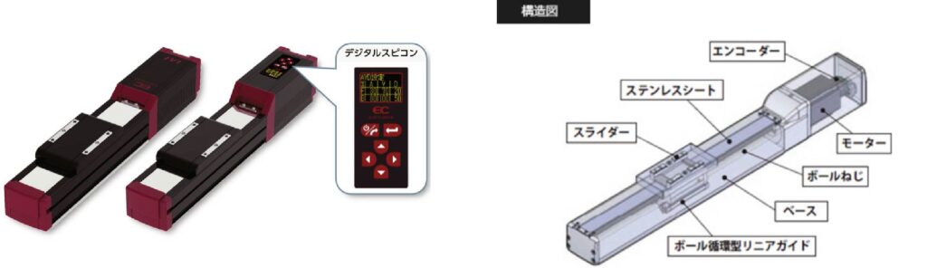 リニアガイド、ボールねじ、サーボモータなどで構成された電動アクチュエーター。スムーズな加速、減速が可能で省エネ効果が高く、長寿命